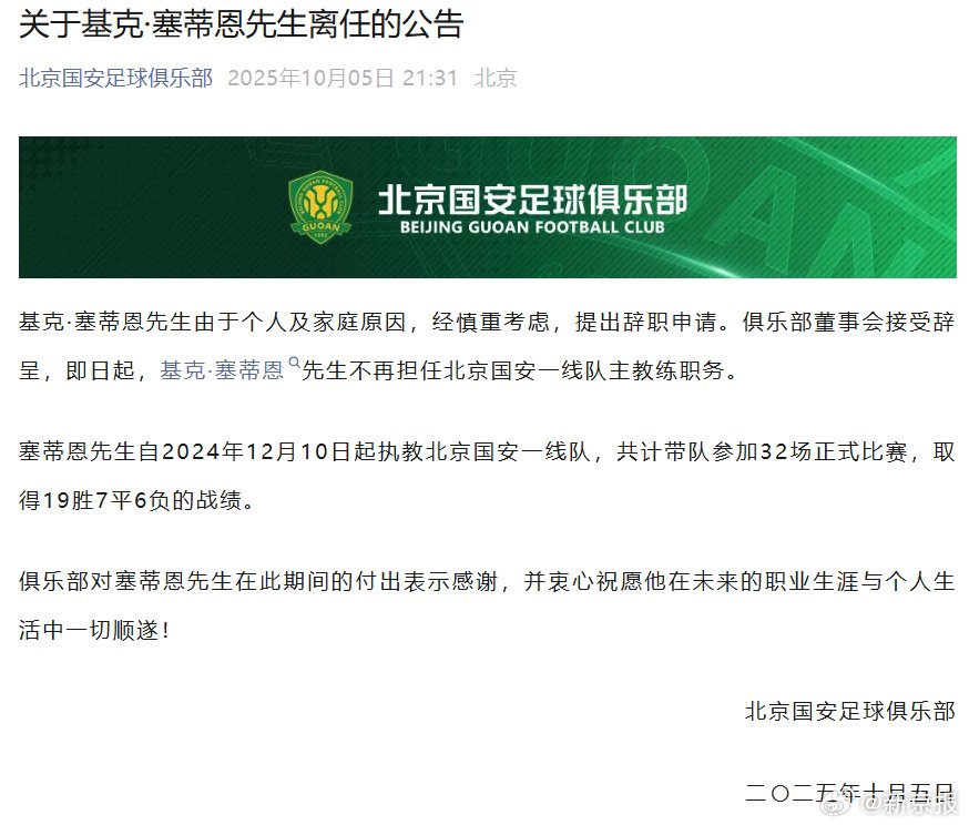 【#施迪安不再擔任北京國安總教練#】10月5日晚,北京國安足球球會發佈《關於基克·施迪安先生離任的公告》,全文如下: