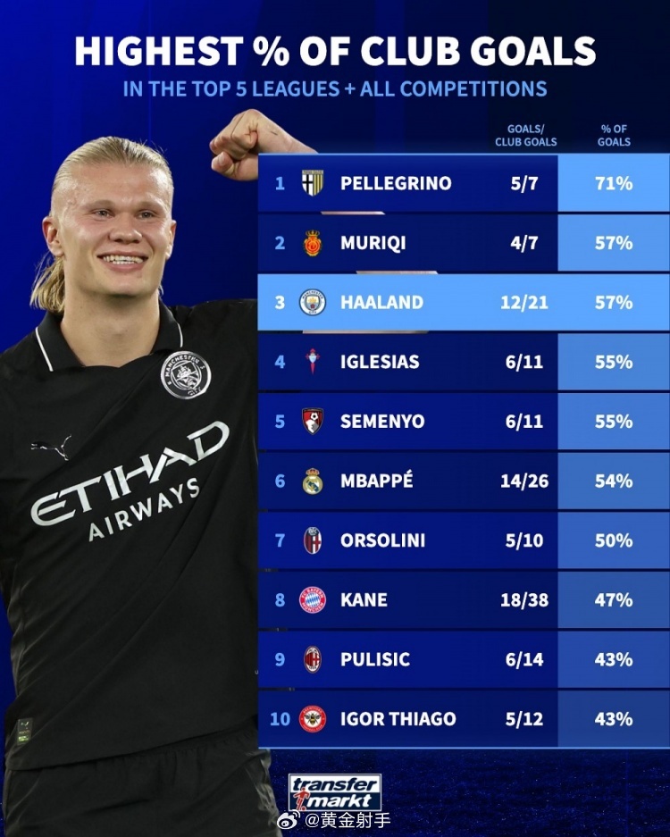 #曼城[超話]# 德國轉會市場統計了今季五大聯賽球員入球佔比,夏蘭特攻入曼城57%的入球,佔比並列第二高,麥巴比54%、簡尼47%。