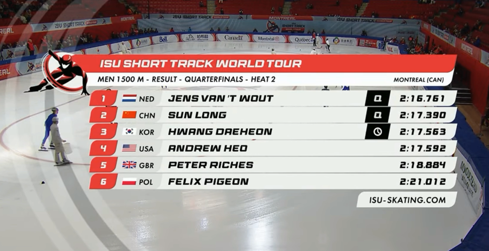 該組範特伍特2分16秒761排名第一,孫龍2分17秒390第二,黃大憲2分17秒563,雖然被孫龍絕殺,但黃大憲還是以小Q身份進入準決賽。