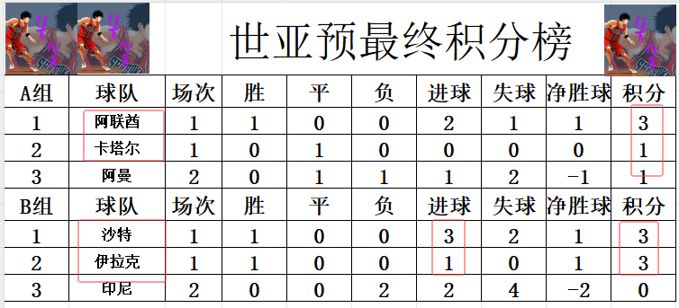 積分榜方面,A組,阿聯酋逆轉絕殺贏波後,超過卡塔爾小組領跑,輸波的阿曼還沒有完全失去機會,他們現在寄希望於阿聯酋能擊敗卡塔爾,他們就還有機會參加第5階段的爭奪,卡塔爾要想小組第1,最後一輪就必須擊敗阿聯酋。B組,伊拉克今天雖然贏波,但是入球比沙特少,他們排在第2,最後一輪和卡塔爾一樣,必須贏波才能直接獲得世界盃參賽資格。印尼2連敗,他們提前鎖定小組墊底,無緣世界盃。