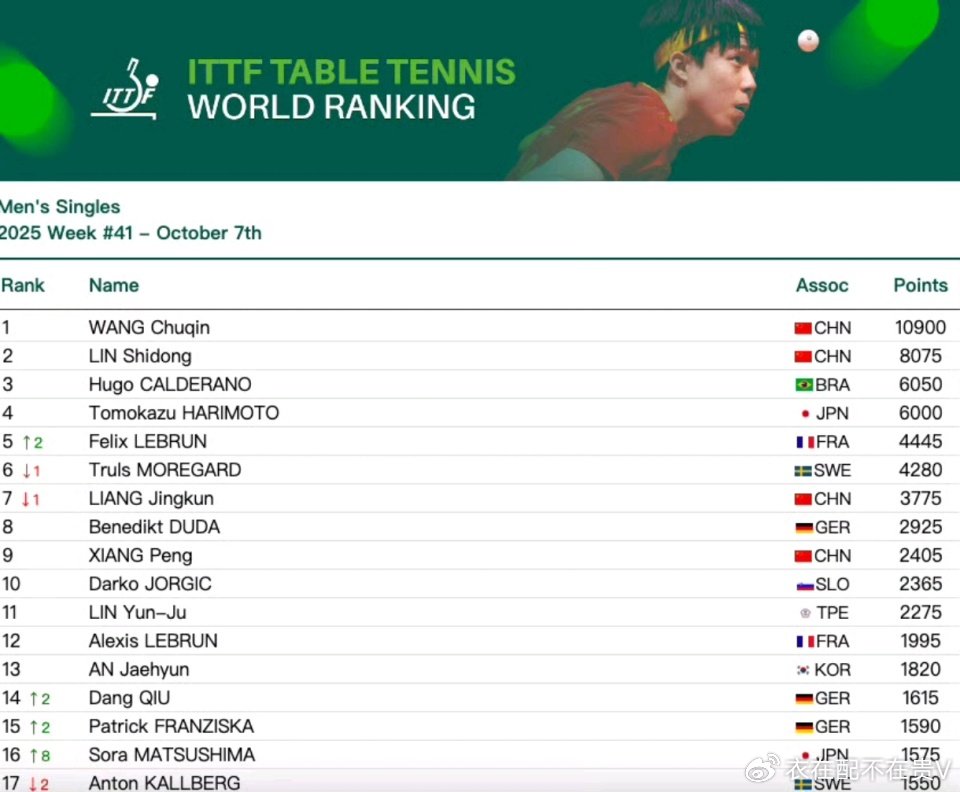 巴西選手雨果以6050分排名第三,日本名將張本智和6000分排名第四,拿到中國大滿貫男單亞軍的法國新星菲歷斯-勒布倫排名上升2位,來到第5。莫雷加德第6,梁靖崑跌至第7,向鵬第9,前十名只有4位國乒選手,不到一半。