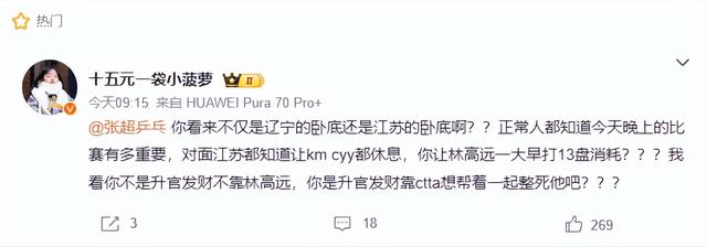 有球迷公開抱怨廣東隊教練組的安排,江蘇隊在團體賽時都讓蒯曼、陳垣宇休息了,一大早林高遠卻在團體賽打了1/3盤消耗,這對林高遠混雙決賽的體能有影響。