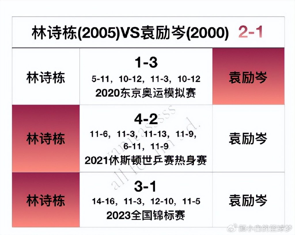 林詩棟VS袁勵岑2勝1負。林詩棟與這7人的交手只有面對向鵬是劣勢,其餘的不是均勢就是優勢,戰績合計是37勝16負,這足以說明林詩棟就是同期中最強的存在。