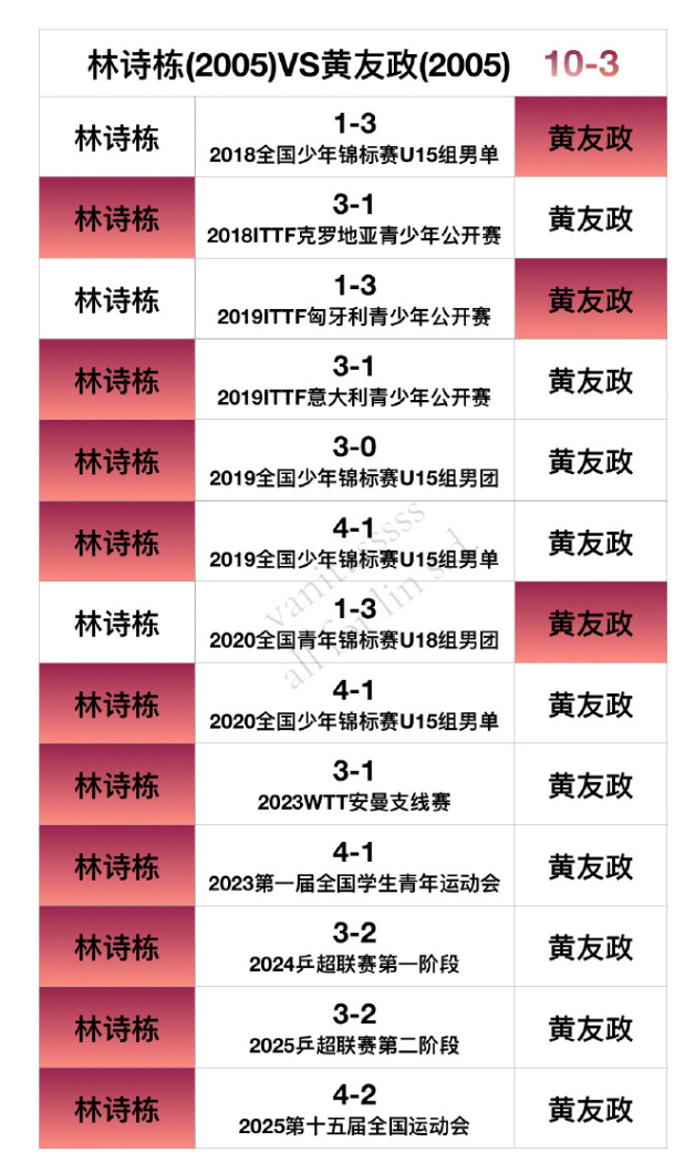 林詩棟也表示自己作為海南省唯一的乒乓球運動員登台就是努力拚每一分,他希望自己能走得更遠。一位博主統計了林詩棟與同期的國乒選手交手戰績。