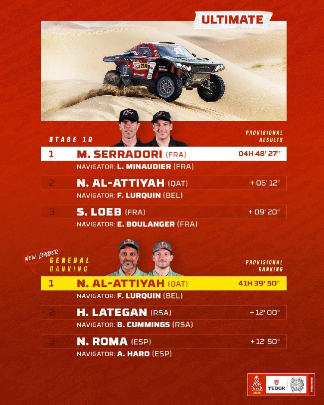 今天汽車組產生了全新的冠軍,這位法國車手在2020年後終於等來了自己的第二個賽段冠軍。法國人馬修·塞拉多里(Mathieu Serradori)駕駛CENTURY CR7賽車以快出阿爾-阿提亞6分12秒的優勢獲得了冠軍。