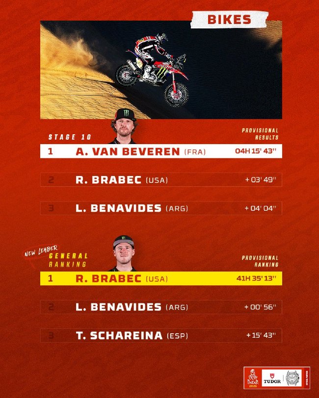 本賽段最大的贏家再次落到了本田車隊,駕駛42號賽車的阿祖安盧比斯·範·貝弗倫(Adrien Van Beveren)領先自己的隊友里奇·布拉貝克(Ricky Brabec)3分49秒獲得本賽段冠軍。而布拉貝克在本賽段結束後再次回到了積分榜的頭位。KTM車隊車手盧西亞諾·貝納維德斯(Luciano Benavides)本賽段獲得第三位,在總排名上落後56秒排在第二位。