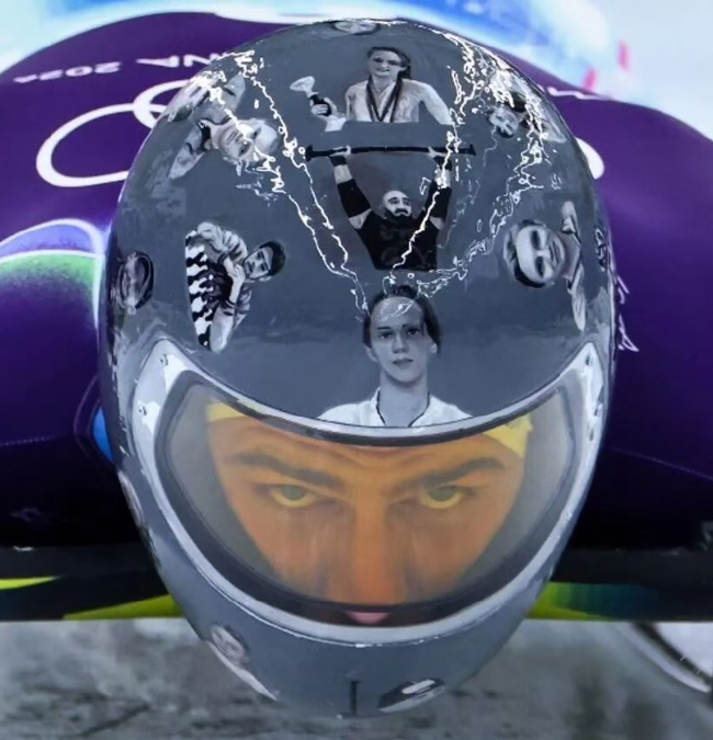 他在社交媒體上介紹自己將在冬奧會比賽中佩戴的頭盔,引發了極大關注,在這頂頭盔上,印滿了一張張黑白照片……