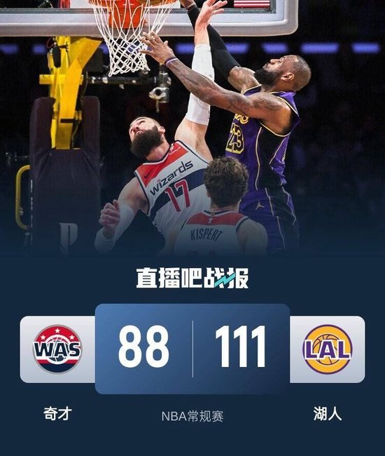 首節之爭湖人雖然佔據上風但場面優勢並不大,在巫師首節命中率和三分命中率都在30%出頭的情況下,湖人才靠著末段小優勢拉開6分領先;次節湖人前期雖然一直佔據上方但始終拉不開比數,不過好在占士和一字眉穩定輸出雙雙在這一節拿到10分,湖人也在末段將優勢拉大至10分進入下半場。休息歸來湖人搶開局上來一波14-4的攻勢將優勢擴大至近20分,後半段湖人還是無法完全擊垮對手又被巫師追至10分附近;不過整個下半場的劇本都是如此,湖人無法徹底拉開比數但巫師也無法追至個位數製造威脅,布朗尼則在最後時刻得到上場機會。最終,湖人主場輕取巫師拿下比賽。