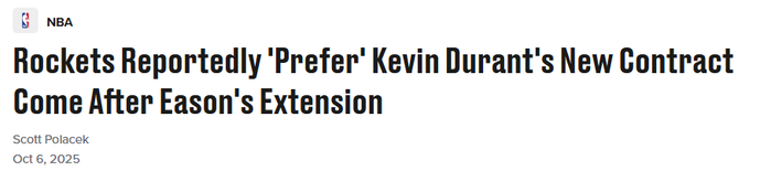 杜蘭特是火箭隊今年休賽期的核心收購,但目前他的合約已進入最後一年。不過所有跡象都表明,他將按照NBA「38歲以上規則」的規定,簽下一份允許範圍內最高2年1.22億美元續約合約。這支球隊與這位未來名人堂成員都希望在今季及之後的賽季衝擊總冠軍。