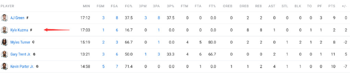 作為球隊的正選大前鋒,全場比賽17分鐘,6中1,三分1中0,拿到2分8籃板1助攻1失誤,命中率16.7%。最離譜的是在籃下出手了4次只命中一球,上籃都上出了一個過橋!古斯馬這個狀態真是令人無奈。