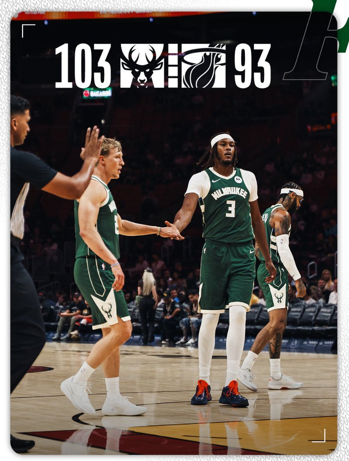 香港時間10月7日,NBA季前賽,公鹿103-93大勝熱火。這場比賽公鹿的核心揚尼斯只參與了賽前的訓練但沒有出戰,熱火的核心泰萊-希羅也沒有出戰,前三節兩隊都打得有來有回,可末節熱火突然斷電被打35-22吞下慘敗。