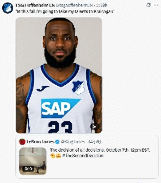 而德甲賀芬咸也藉機在社媒玩了一把梗。他們的英文社媒帳號曬出占士身穿賀芬咸波衫的P圖照片,並配文道:「這個秋天,我將把天賦帶到克雷希高(賀芬咸所在地)。」