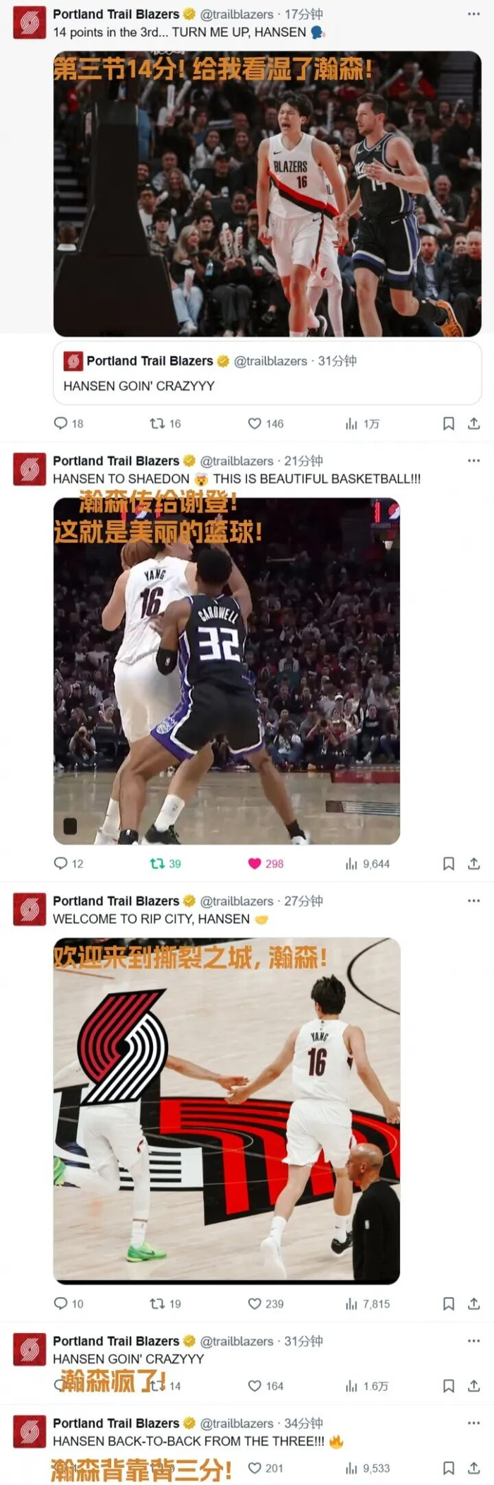 拓荒者官推連發8條楊瀚森內容