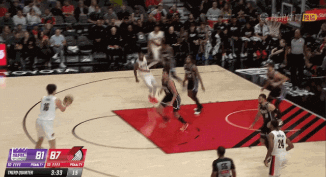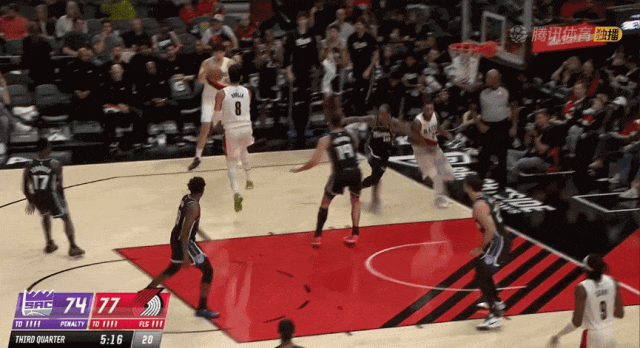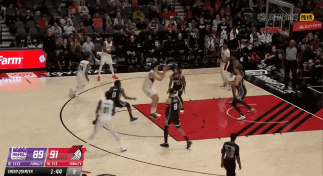 好戲仍在繼續,肘位背身持球佯裝背打突然敲出擊地,夏普沿底線切入躍起飛身大力入樽。這種高低位,中鋒與後衛的連線火龍味兒十足,難怪拓荒者當地自媒體把這個配合定義為: