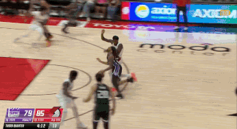 這個回合稱得上相當精彩,防守端先成功干擾德文-卡達的衝筐,自己搶下籃板順帶推進下快攻上籃得手。
