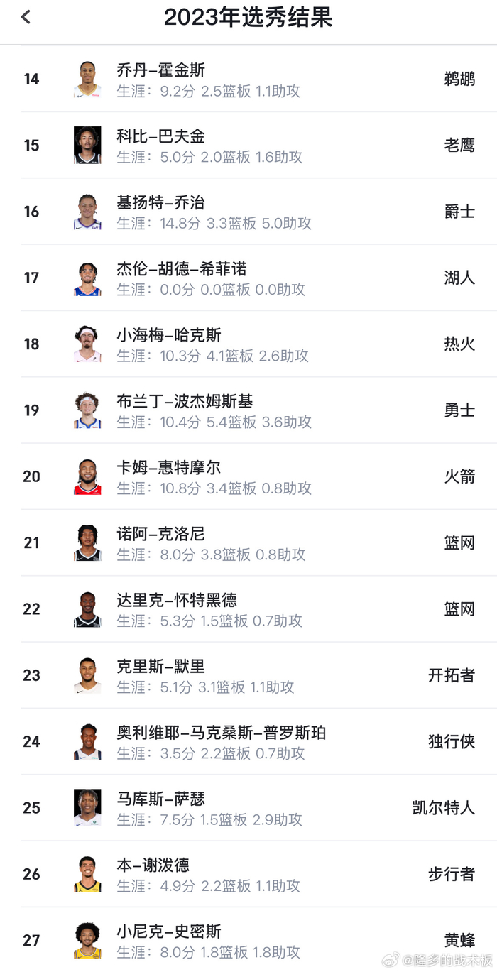NBA 網隊裁掉2023年22號秀韋特黑德,杜克射手飽受傷病困擾 10月14日 08:20 新浪網 sports-nba-auto-hilite 網隊宣佈裁掉達瑞克-韋特黑德,2023年的22號秀! 韋特黑德來自杜克大學,198cm投射型側翼,前五星高中生(一度全美第二),進入聯盟以來飽受傷病困擾,登場機會甚少,選秀模板泰萊-希羅。 特別聲明:以上文章內容僅代表作者本人觀點,不代表新浪網觀點或立場。如有關於作品內容、版權或其它問題請於作品發表後的30日內與新浪網聯繫。