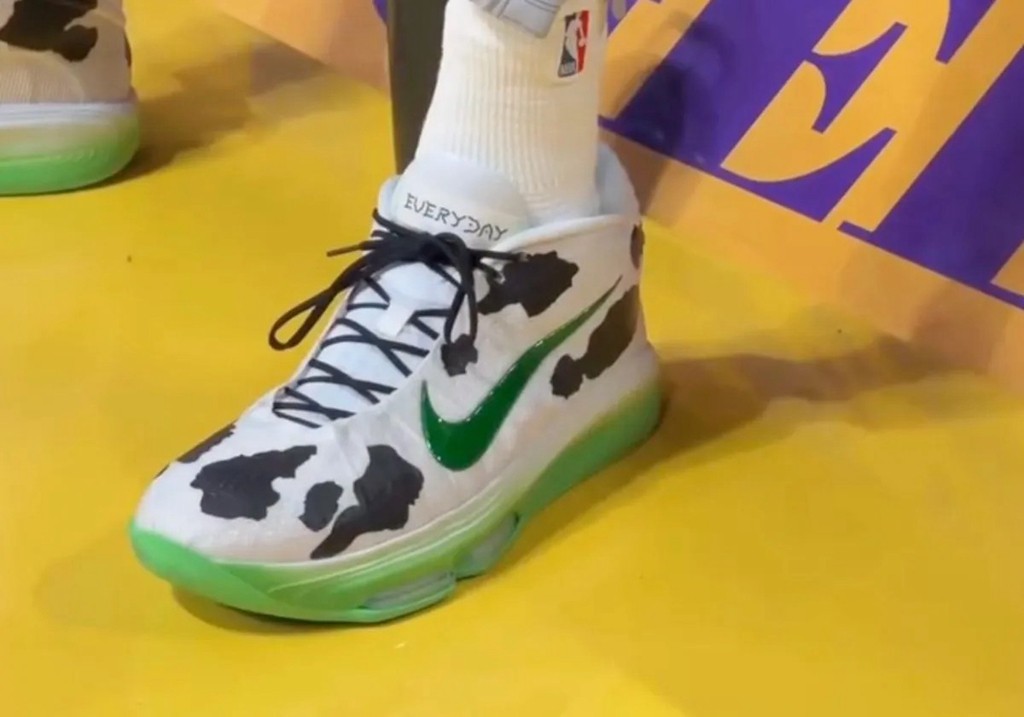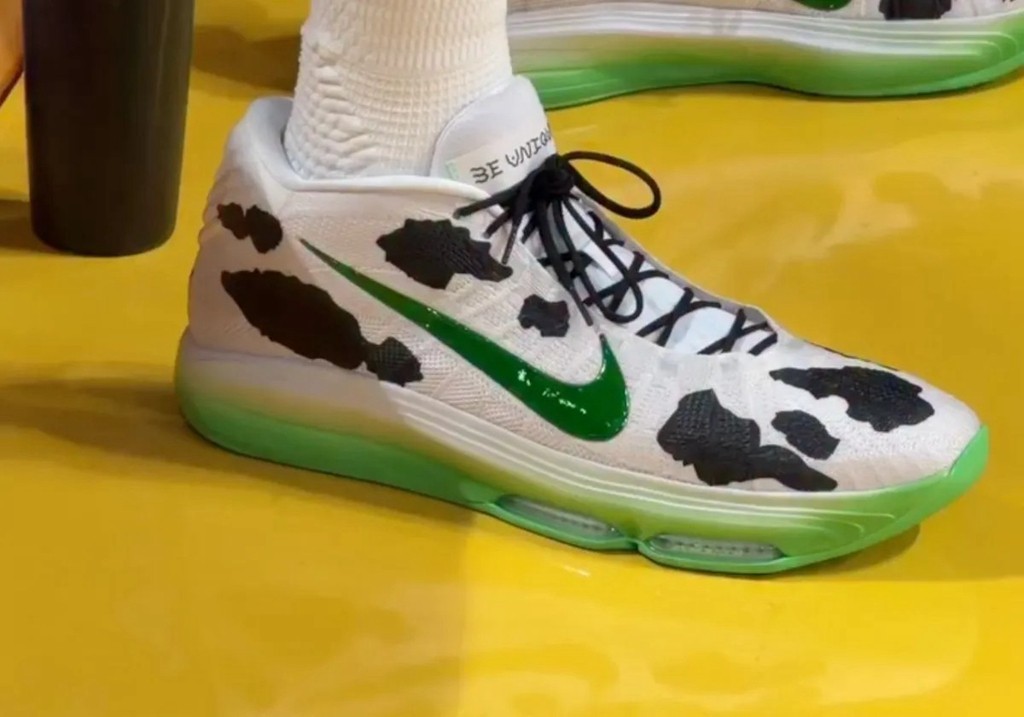 作為如今 Nike 的簽約球星之一,雲班耶馬在昨天對陣湖人的比賽中,上腳了此前從未見過的最新 PE。鞋型依舊是 GT Hustle 3,也是文班目前最愛穿的戰靴。外觀方面,以可愛的奶牛圖案覆蓋,其餘細節則是史萊姆綠色。這樣的設計組合,靈感來自復古科幻片中經常出現的 UFO 吸走奶牛的場景,也呼應文班外星人的外號。但遺憾的是目前這雙 PE 暫無市售計劃,不知道你能打幾分呢?