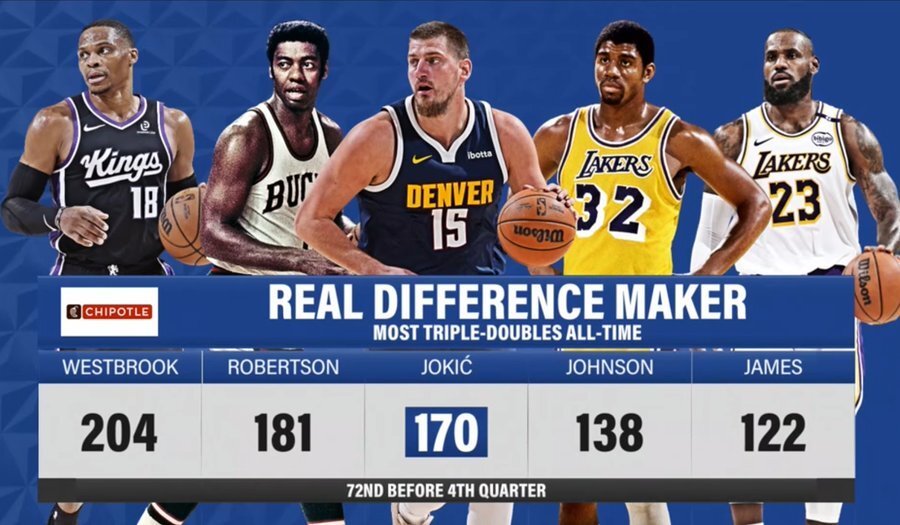 這是約基治職業生涯的第170次大三元,第72次三節砍下大三元。