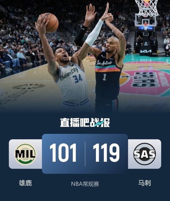 開場後字母哥表現相當強勢多次衝擊內線上演大力入樽,在一次和字母哥的對抗中雲班耶馬受傷離場,雖然字母哥表現強勢,但馬刺外線多點開花頻頻命中三分反而取得領先,霍斯首節狀態火熱單節砍下12分。第二節上來公鹿率正選力將比數反超,不過立即回應一波15-0的攻勢將比數反超並建立起兩位數優勢,雲班耶馬回歸後展現出。易邊再戰,馬刺依舊攻勢兇猛,公鹿這邊進攻依舊沒有起色,馬刺單節淨勝24分將分差拉大到30分以上。最後一節兩隊都是早早還上第三陣容,雖然公鹿追回一些分數但無奈此前分差過大,最終馬刺119-101大勝公鹿結束2連敗,公鹿遭遇3連敗。