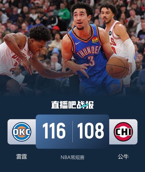比賽開場,雙方進攻效率都一般,雷霆外線連續炒籃,但依靠自己的積極性獲得更多進攻機會,首節結束還是以26-22領先。次節回來,以賽亞·祖撐起球隊進攻,但公牛這邊也手感回暖,亞布塞萊連續打成,雙方陷入拉鋸戰,半場結束雷霆55-54領先。易邊再戰,公牛進攻端開始斷電,雷霆繼續發力逐漸拉開比數,麥簡尼外線連續投中,三節結束雷霆87-76領先。末節回來,雷霆穩紮穩打維持場上優勢,比賽結果逐漸蓋棺論定,最終雷霆116-108力克公牛。