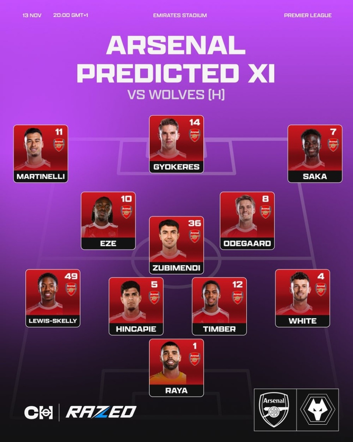 阿仙奴正選預測(433):拉也;韋特,祖利安,因卡皮耶,斯基利;埃澤,蘇維文迪,迪勤懷斯;沙卡,哲凱賴什,馬田內利
