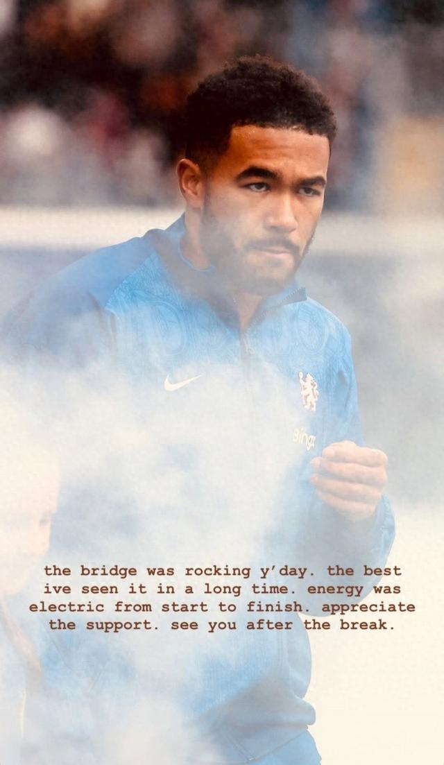 里斯-占士在社媒曬照,配文道:「藍橋昨日的比賽山呼海嘯,是我很長時間看到最棒的氛圍。你們全場都保持了激情和活力,感謝大家的支持,我們國際比賽日後再見。」