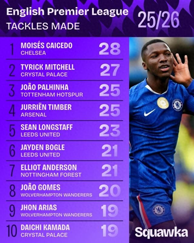 今季英超偷球榜前十:卡些度28次第一,添巴25次第四