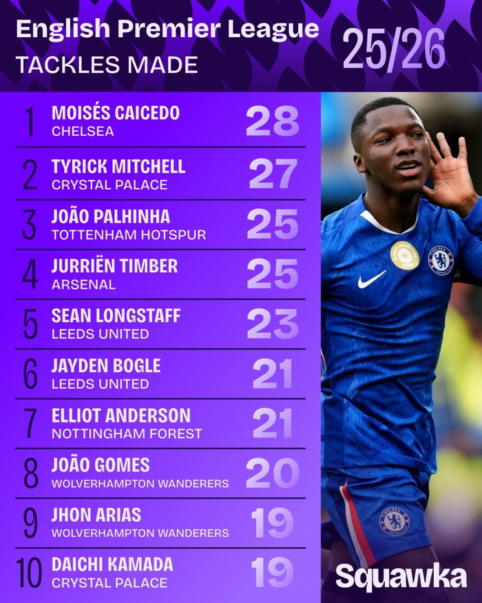 香港時間10月7日,知名數據機構Squawka統計出了今季英超前7輪過後偷球數排名前10的球員,車路士的半場大將莫伊塞斯-卡些度以28次排名第一,水晶宮的左後衛泰瑞克-米曹以27次位列第二,托端拿姆熱刺半場帕利尼亞以及阿仙奴的右後衛祖利安同以25次並列第三。