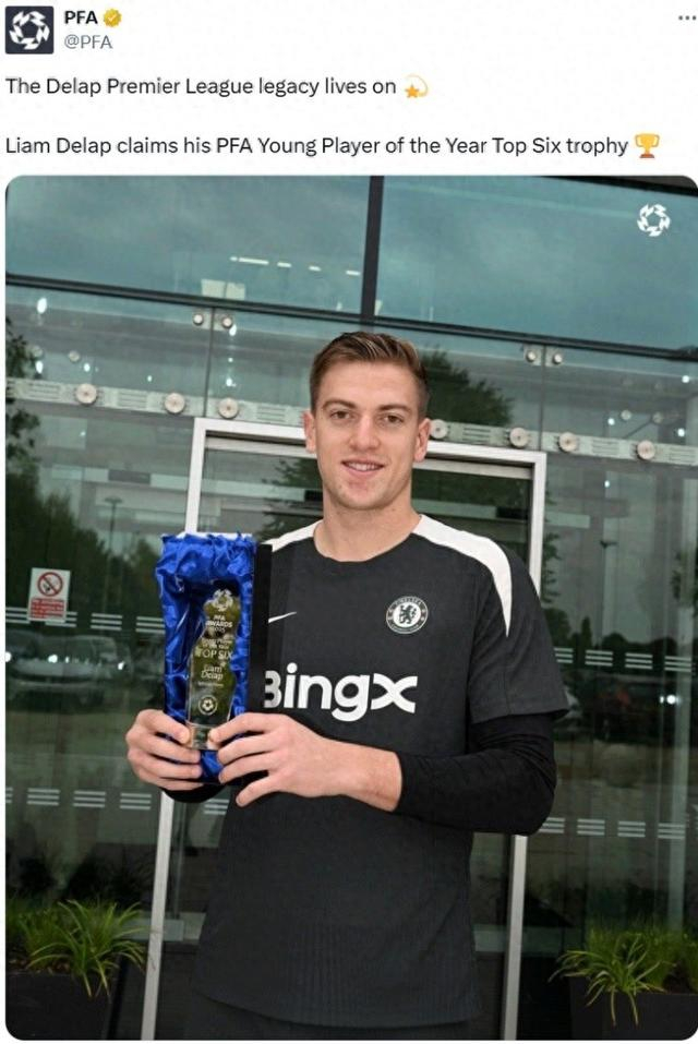 香港時間10月7日訊 車路士球員戴納此前榮膺PFA年度最佳年輕球員前6,PFA官推也曬出球員領取獎盃的照片。