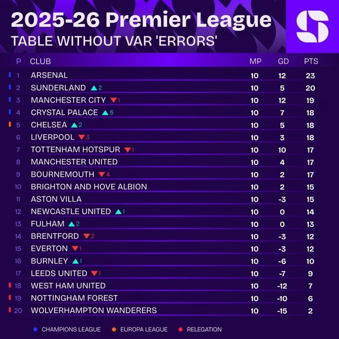 Squawka列去除VAR爭議判罰英超積分榜: