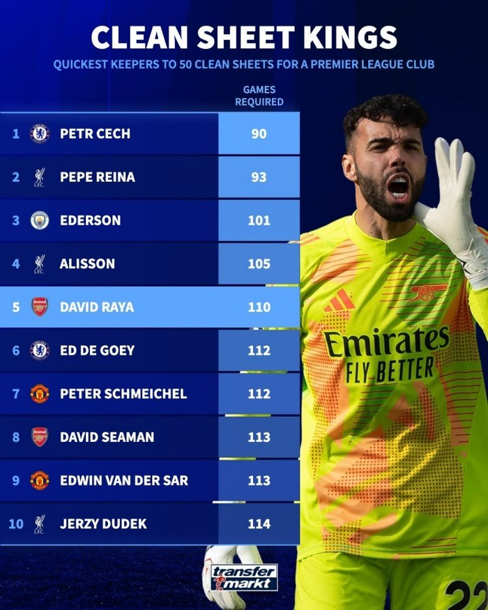 阿仙奴在歐冠盃作客3-0擊敗布拉格斯拉維亞,拉也完成了阿仙奴生涯的第50場零封,共計用了110場比賽,排名英超球會門將50場零封第五快。