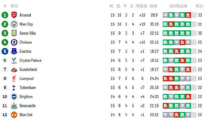 香港時間12月7日,英超第15輪先賽7場。榜首阿仙奴翻車輸波,而車路士和利物浦延續低迷不勝,曼城成為最大贏家,豪取3連勝後距榜首分差縮小至2分。