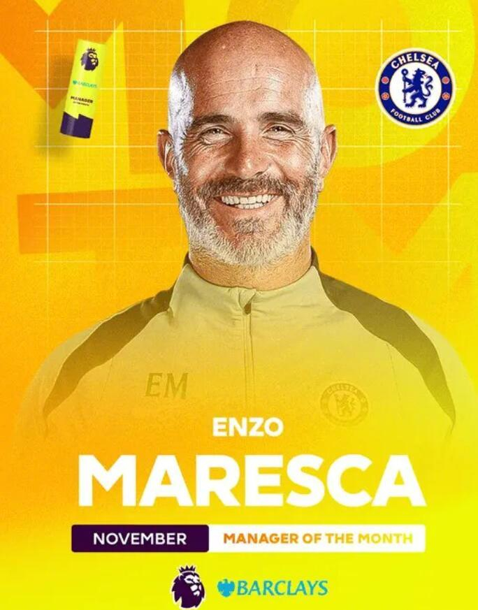 【官方】車路士總教練馬雷斯卡當選英超11月最佳總教練,他帶隊11月3勝1平,第二次獲得該獎項。#英超…