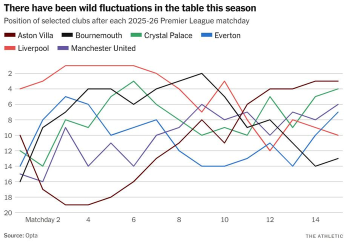 般尼茅夫在五週內從第二名跌至第14名。曼城曾低至第13名,也高居過第二名。升級隊新特蘭的聯賽排名相對穩定,但即便是這一點也代表了他們對今季不可預測性的貢獻:夏天時,誰會把他們視為除降班候選之外的任何角色呢?