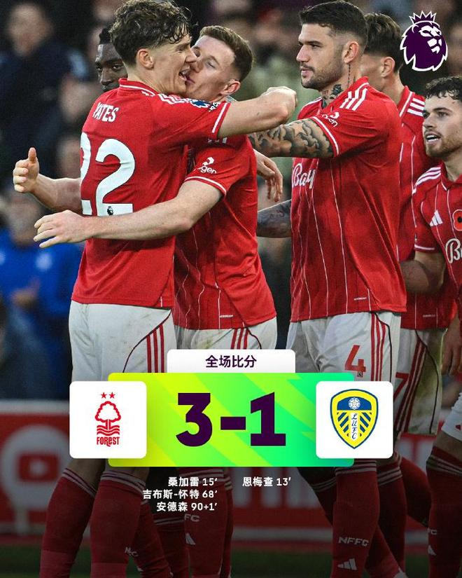 上半場,恩梅查禁區內低射破門,幫助列斯聯1-0領先,隨後不久,桑加雷補射破門,幫助諾定咸森林1-1快速扳平。下半場,基比斯-韋特、安達臣各進一球,幫助諾定咸森林3-1完成逆轉。