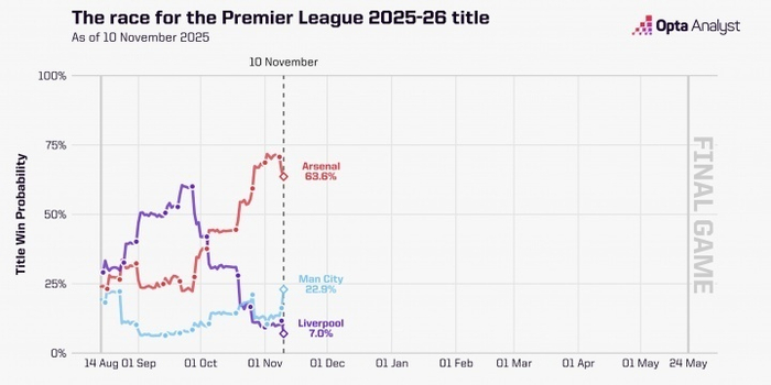 Opta曬英超今季截至目前的爭冠概率走勢:利物浦從賽季初被看好跌到目前的7%,阿仙奴目前63.6%,曼城目前22.9%。不過藍月提升速率很可靠,這是不少阿仙奴粉絲憂慮的。