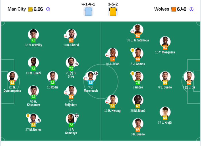 曼城正選:25-當拿隆馬、27-紐尼斯、45-胡桑諾夫、15-格伊、33-奧賴利、16-洛迪高、20-貝拿度-施華、4-賴因德斯(61’47-科頓)、42-塞梅尼奧、10-謝爾基(73’11-杜夫)、7-馬爾穆什(73’9-夏蘭特)。
