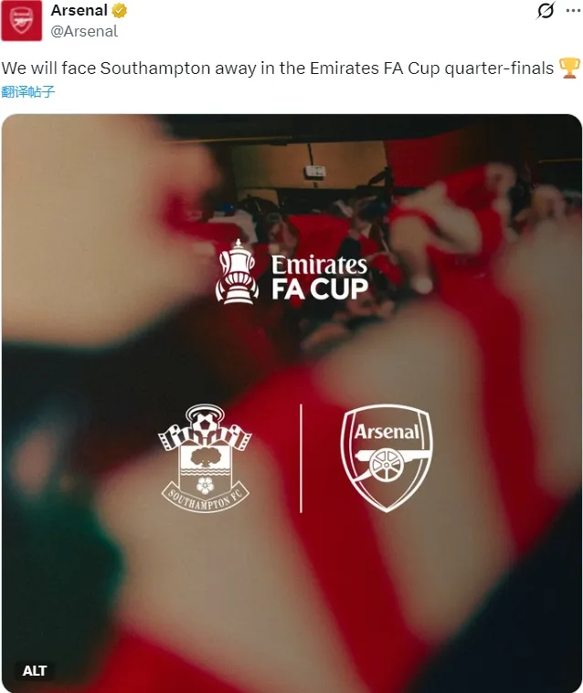 官方:阿仙奴在足總盃8強中抽到了修咸頓,兵工廠將作客作戰。