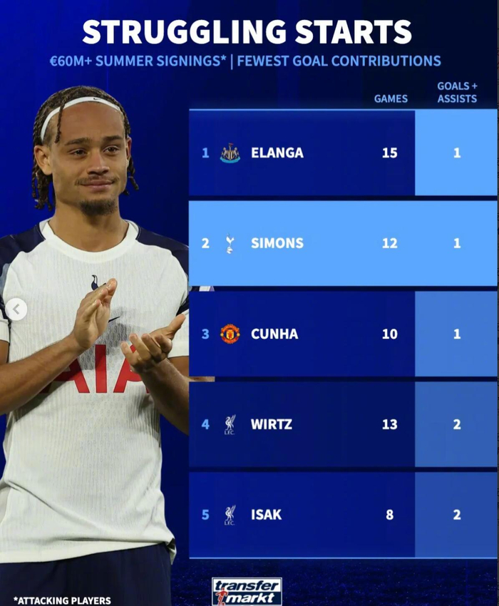 英超6000萬攻擊手榜:埃蘭加、西蒙斯、根夏並列墊底