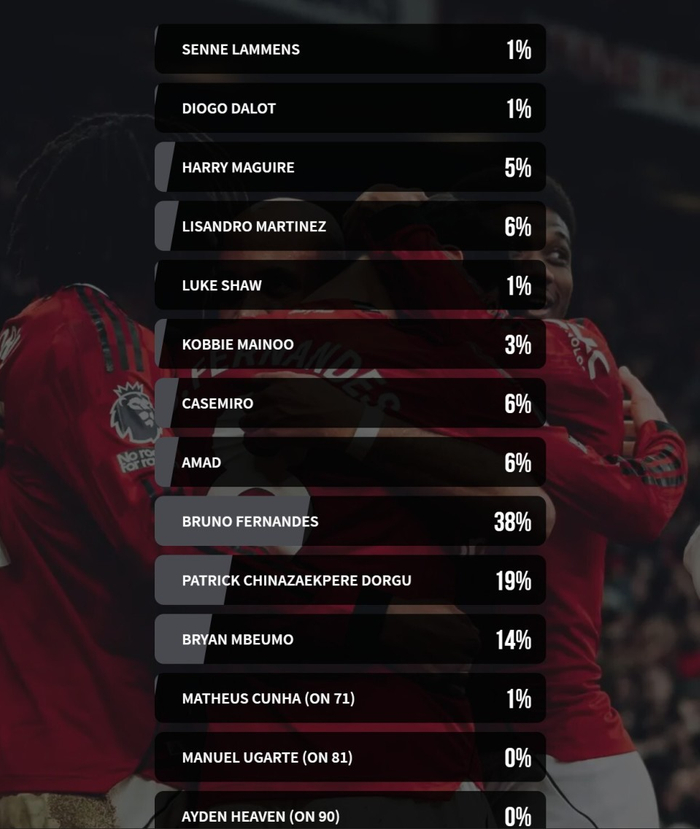 賽後,在曼聯官網發起的投票中,B費獲得了38%球迷的投票,當選隊內最佳,表現同樣出色的杜古、安保姆分別獲得了19%、14%的投票。