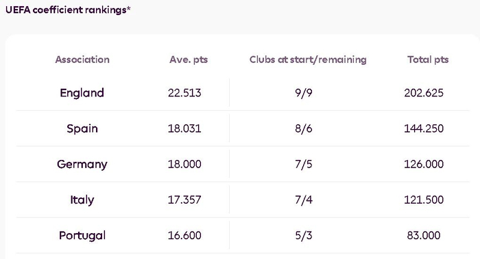小組賽過後,英格蘭在歐足聯繫數排名中遙遙領先,該排名衡量的是每個國家的球會在今季歐洲三項賽事中的表現。只要英超能保持前兩名的位置,那麼聯賽第五就能連續第二個賽季直接獲得歐冠盃小組賽正賽資格。