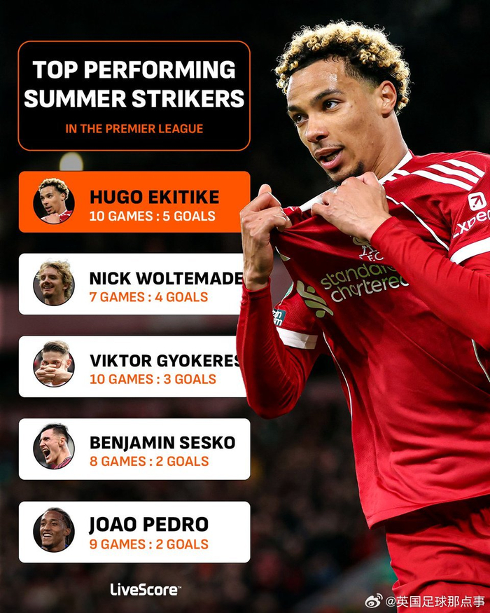 英超新援前鋒數據榜,伊基迪基10場5球領跑