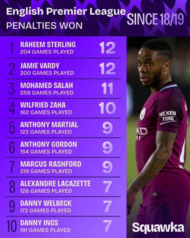 18-19賽季以來英超造點榜:史達寧、華迪12次最多,沙拿11次