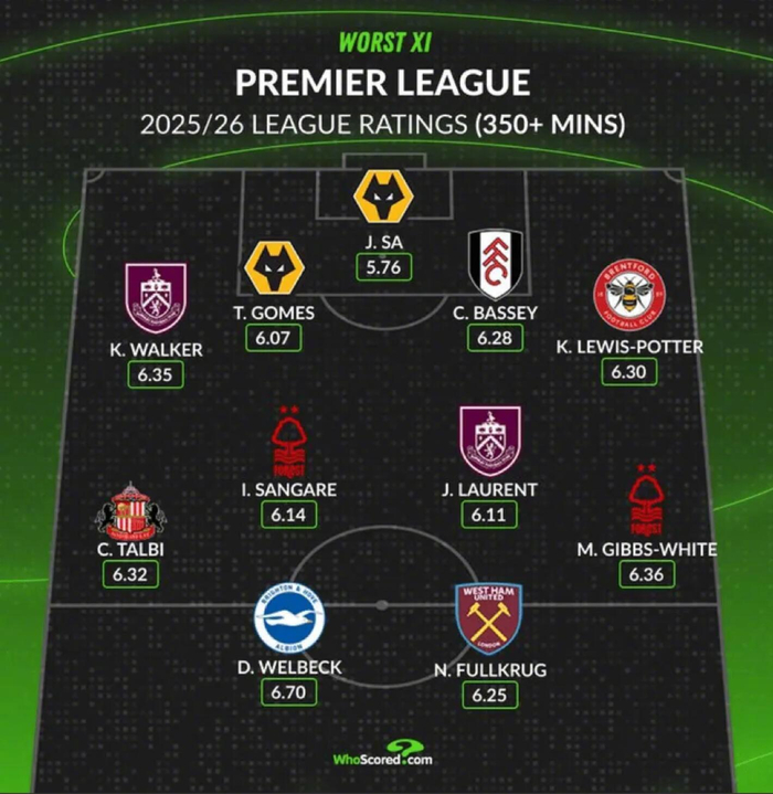 Whoscored根據球員評分,評選出了今季目前英超聯賽里最令人失望的陣容,入選該陣容的球員出場時間都不少於350分鐘。