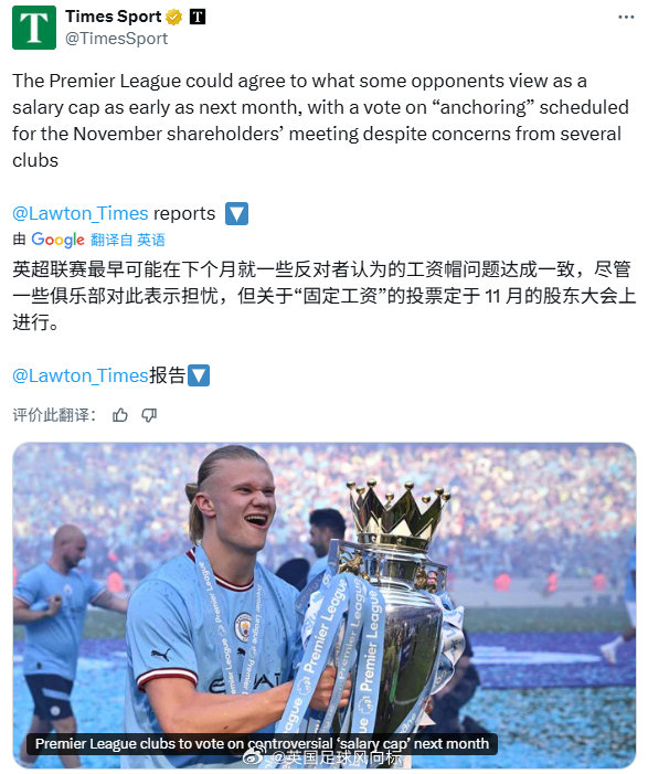 重磅:英超薪金帽制度即將投票
