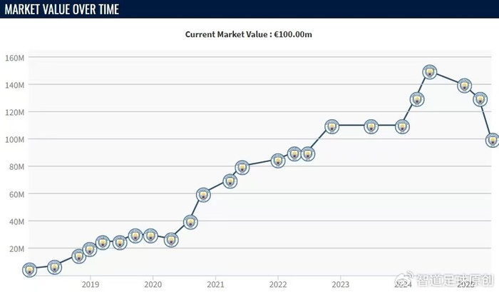 這意味著科頓連續4次德轉身價更新後下跌,在2024年科頓的身價達到1.5億歐元,但最近幾次德轉更新是一路走低,目前科頓的身價為1億歐元,這次德轉更新下跌之後,就跌出了億歐先生行列。