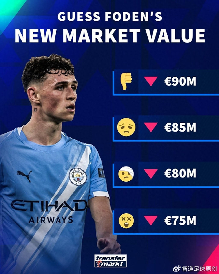 德轉將會在香港時間10月17日更新英超球員身價,德轉官方社媒10月16日發圖預熱曼城的25歲英格蘭前鋒科頓的身價變化,就圖中內容來看,科頓註定要跌破1億歐元,英超億歐先生-1,最高9000萬歐元,最低7500萬歐元,你猜德轉會給科頓新身價定位多少?