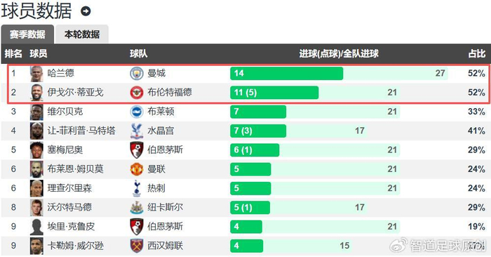 在英超射手榜上,夏蘭特攻入了14個入球領跑,不含12碼,一人的入球數佔據曼城全隊的52%;伊戈爾-泰亞高攻入了11個入球排名第二,含5個12碼,一人的入球數佔據賓福特全隊的52%。入球數佔全隊比例排名英超的第三的是馬特塔,攻入了7個入球,一人的入球數佔據水晶宮全隊的41%。