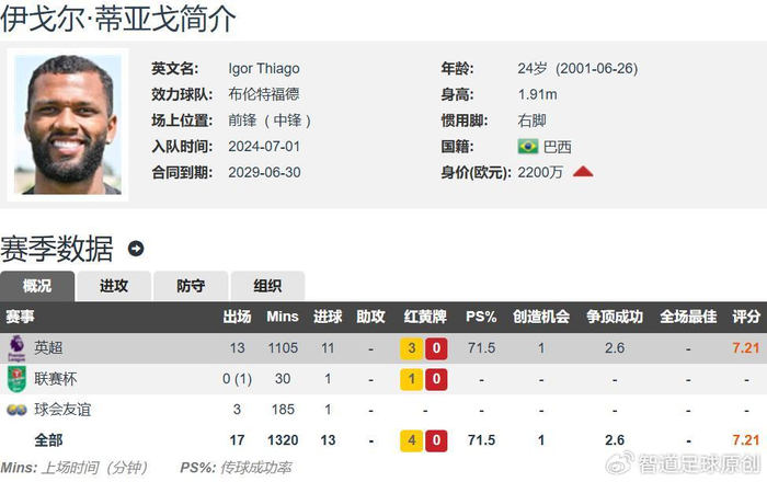 夏蘭特大家都非常熟悉了,這次介紹下賓福特的巴西前鋒伊戈爾-泰亞高,現年24歲,身高1.91米,右腳中鋒,與賓福特的合約至2029年,德轉估價2200萬歐元。伊戈爾-泰亞高今季至今英超全勤,出戰了全部的13場英超的比賽,貢獻11球0助,是一位很純粹的射手。