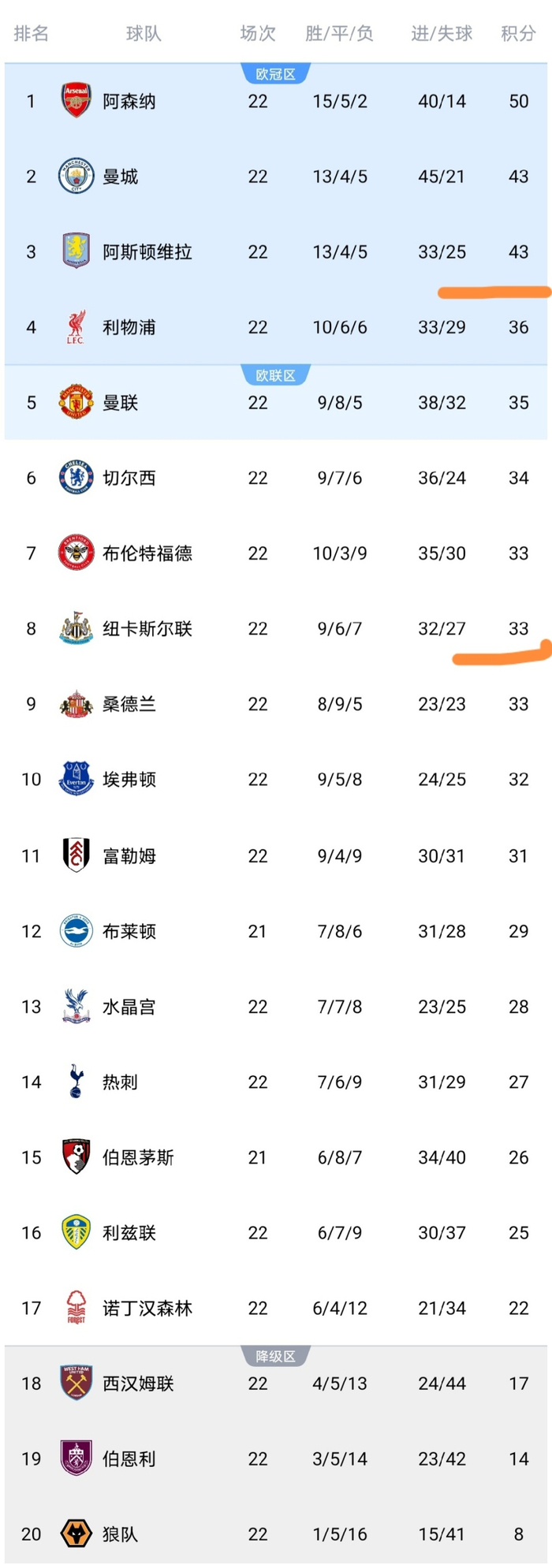 今天淩晨,英超第22輪又結束了2場較量,維拉、紐卡等隊出戰,我們來看看這兩場比賽之後,英超積分榜的變化。